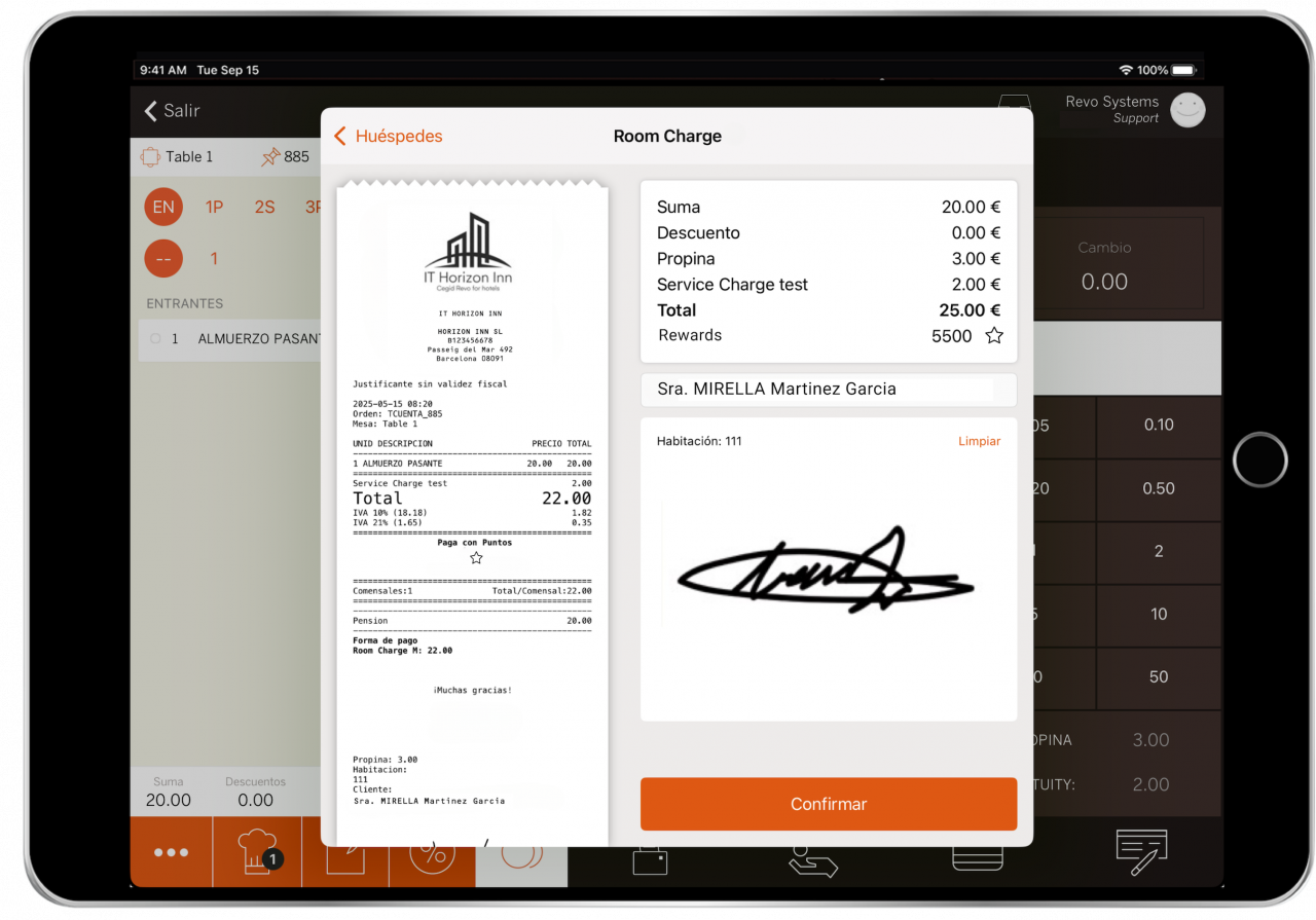 Permite que tus huéspedes carguen sus consumos directamente a la habitación, mejorando su experiencia al evitar pagos separados en el restaurante.